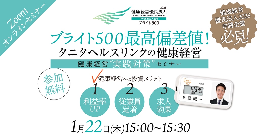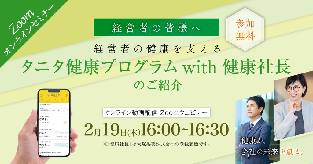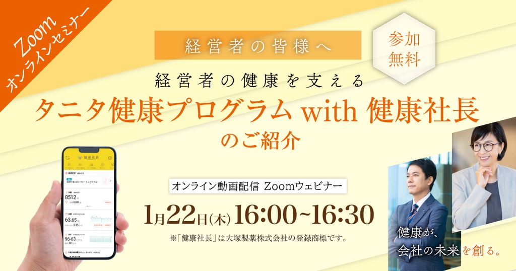 【Zoom 無料オンラインセミナー】経営者の皆様へ 経営者の健康を支える「タニタ健康プログラム with 健康社長」のご紹介