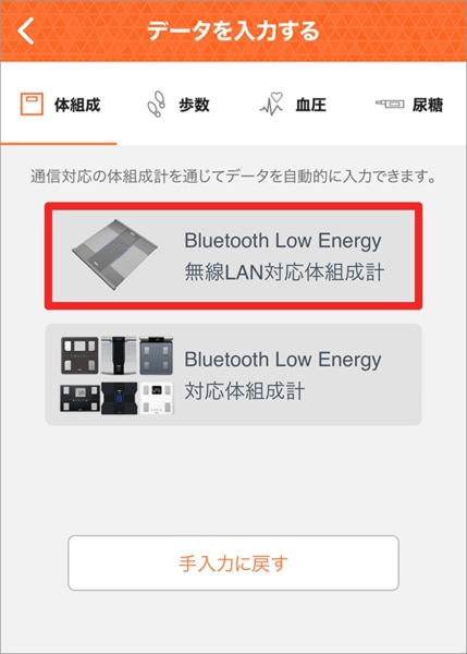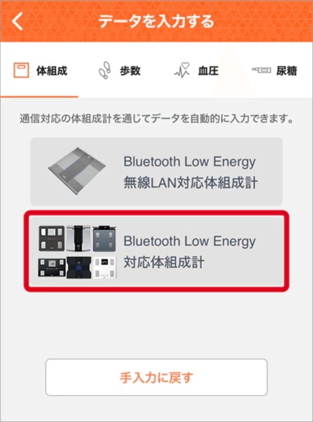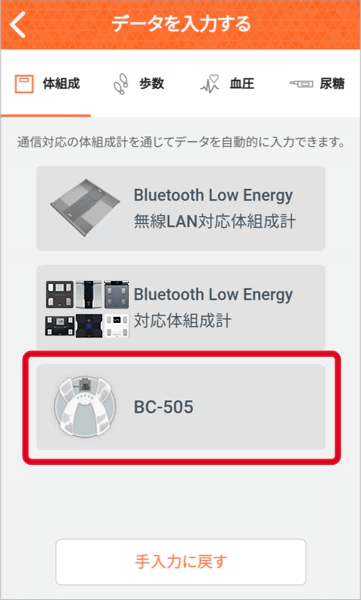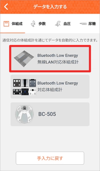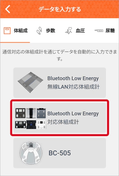 「体組成計」を選択し、「体組成計からデータを受け取ります…」という表示画面にする。(手入力の画面になっている場合、「体組成計から入力する」を選択する。)