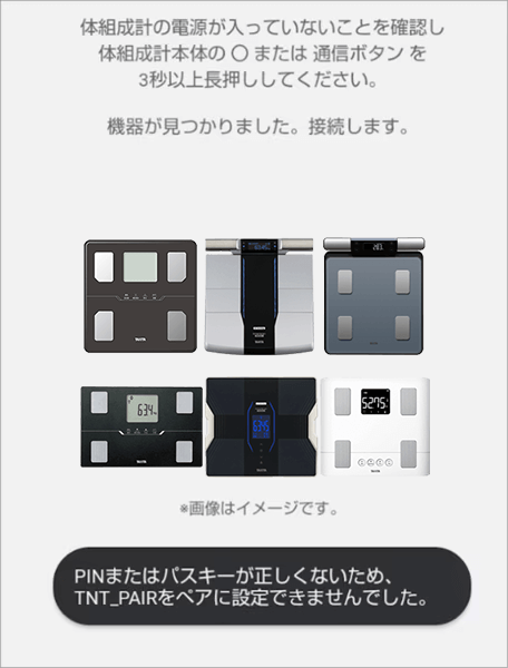 体組成計の電池を外し、入れ直す。スマートフォンの電源を切り、再起動する。