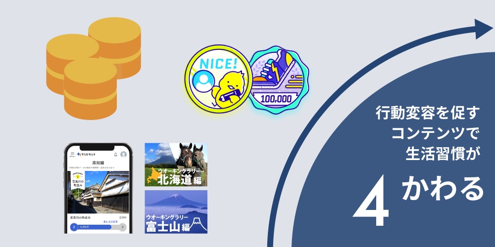 多彩なポイント設計とウオーキングラリー等のイベントで、通年で参加者が飽きずに参加できています。