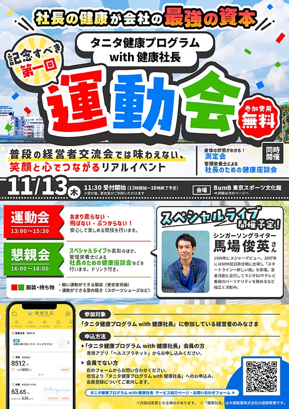 株式会社タニタヘルスリンク(略称:THL)は、経営者向けヘルスケアサービス「タニタ健康プログラムwith健康社長」の健康応援イベント「タニタ健康プログラムwith健康社長 運動会」を2025年11月13日(木)にBumB 東京スポーツ文化館(東京都江東区)で開催します。本イベントは、「タニタ健康プログラムwith健康社長」を利用する全国の経営者を対象に、会員同士の交流を通じて健康づくりのモチベーションを高めることを目的としています。参加費は無料で、本日6月2日(月)より専用アプリで参加申込の受付を開始します。