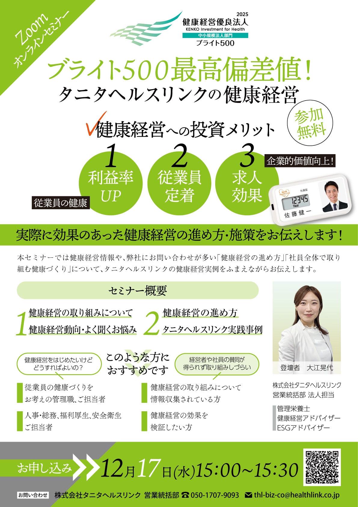 ブライト500最高偏差値!タニタヘルスリンクの健康経営
