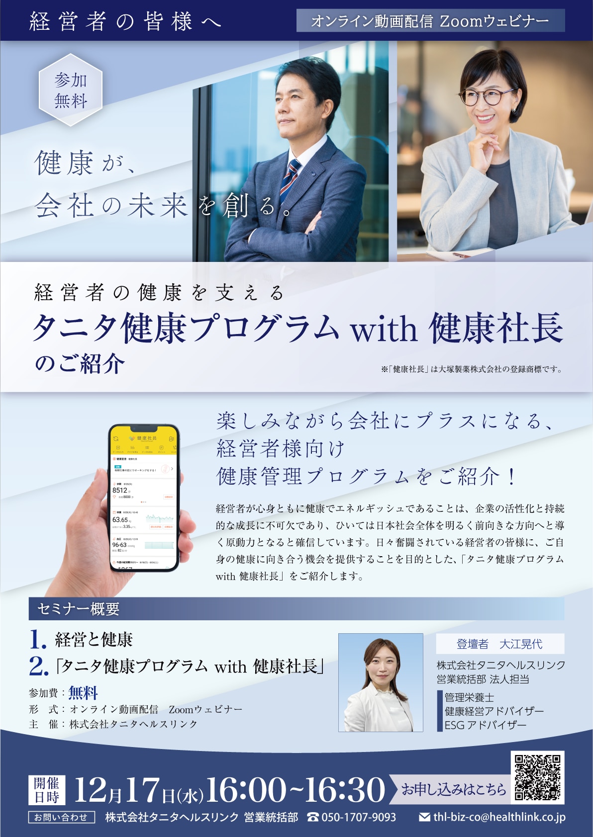 【Zoom 無料オンラインセミナー】経営者の皆様へ 経営者の健康を支える「タニタ健康プログラム with 健康社長」のご紹介