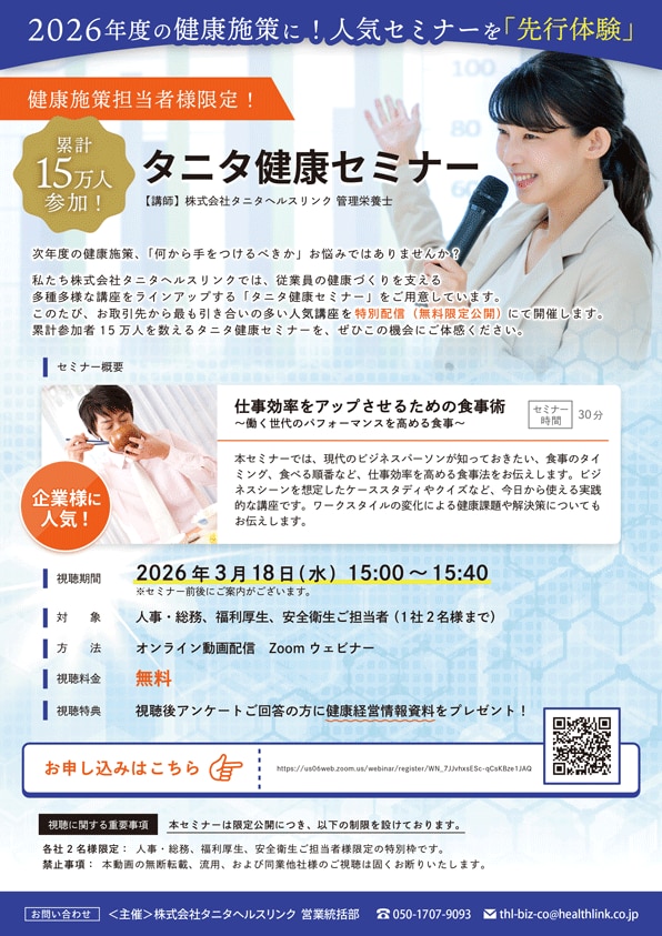 私たち株式会社タニタヘルスリンクでは、従業員の健康づくりを支える多種多様な講座をラインアップする「タニタ健康セミナー」をご用意しています。このたび、お取引先から最も引き合いの多い人気講座を特別配信(無料限定公開)にて開催しますので、是非この機会にご参加いただき、貴社の健康経営の施策立案の一助にしていただければ幸いです。