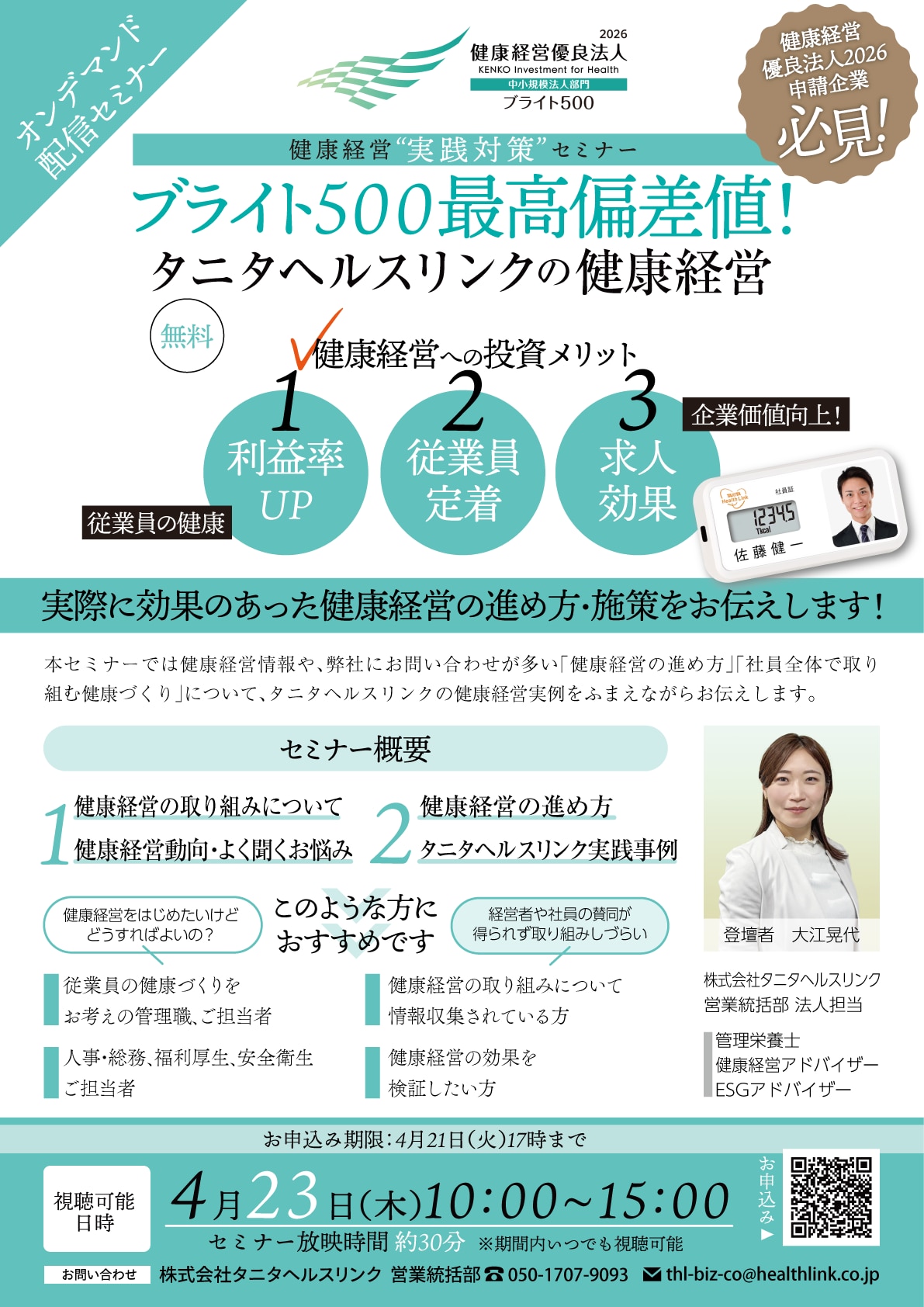 タイトル :ブライト500最高偏差値!タニタヘルスリンクの健康経営