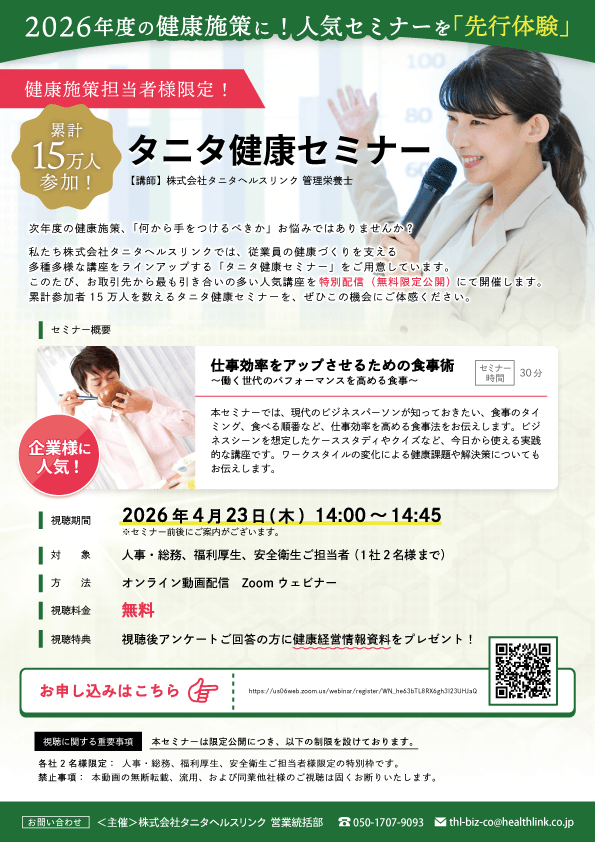 私たち株式会社タニタヘルスリンクでは、従業員の健康づくりを支える多種多様な講座をラインアップする「タニタ健康セミナー」をご用意しています。このたび、お取引先から最も引き合いの多い人気講座を特別配信(無料限定公開)にて開催しますので、是非この機会にご参加いただき、貴社の健康経営の施策立案の一助にしていただければ幸いです。